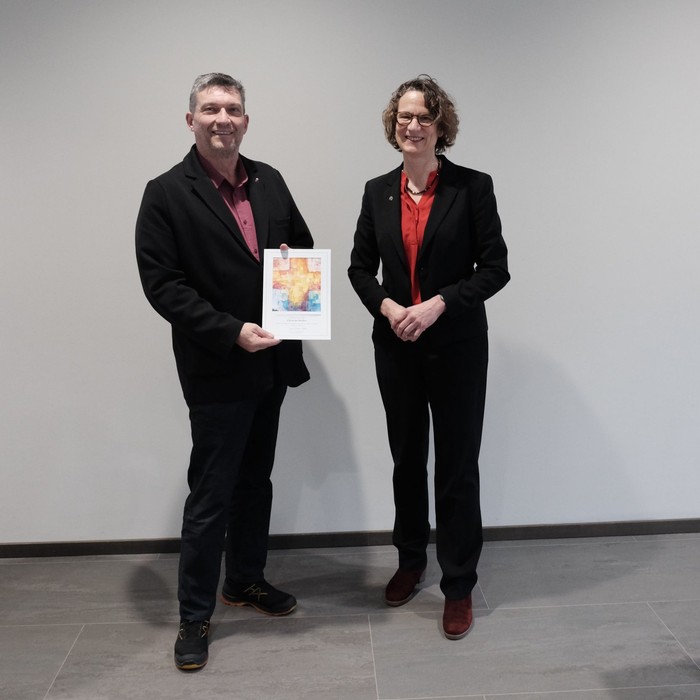 Vier Amtszeiten, also 16 Jahre lang, war Diakon Christian Reifert in der Mitarbeitendenvertretung des Evangelischen Dekanats Biedenkopf-Gladenbach aktiv, drei davon als Vorsitzender. Dafür hat er jetzt die MAV-Ehrennadel der EKHN von Kirchenpräsidentin Prof. Dr. Christiane Tietz verliehen bekommen.