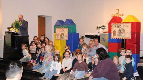 Der gemeinsamen Feierstunde im Kindergarten Herzhausen war am Morgen ein Gottesdienst in der Kirche Holzhausen vorausgegangen. Dort hatten die Kinder symbolisch aus großen Schaumstoffklötzen zwei Häuser gebaut, die sie anschließend mit einem Seil verbanden. Nach dem Gottesdienst lud das Kindergartenteam die Besucher dazu ein, gemeinsam nach Herzhausen zu wandern. Auf dem Weg dorthin erinnerten mehrere Stationen an die Fusion vor zehn Jahren und die Entwicklung, die die Kindertagesstätte „Arche Noah“ seitdem genommen hat. Sie zählt mittlerweile 45 Mitarbeiter und betreut an den beiden Standorten 130 Kinder. (Sascha Valentin)