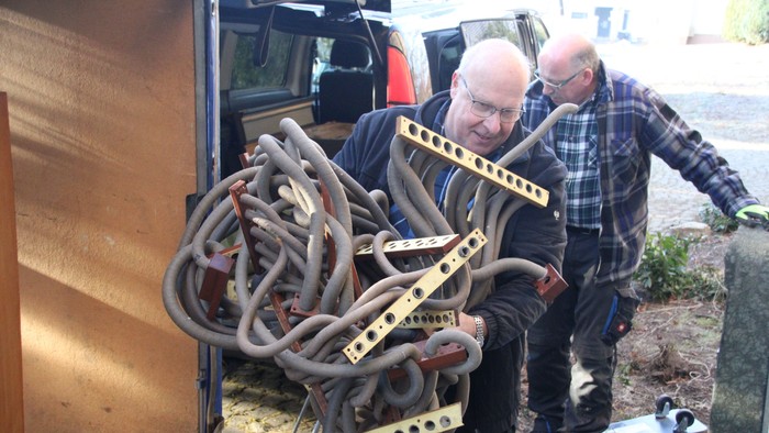 Orgelbaumeister Uwe Hardt (rechts) und sein Mitarbeiter Stefan Braun haben die Orgel in Dänemark abgebaut und tragen die Einzelteile nun in die Lixfelder Kirche, wo sie sie in den nächsten Wochen wieder zusammenbauen werden. (Foto: Sascha Valentin)