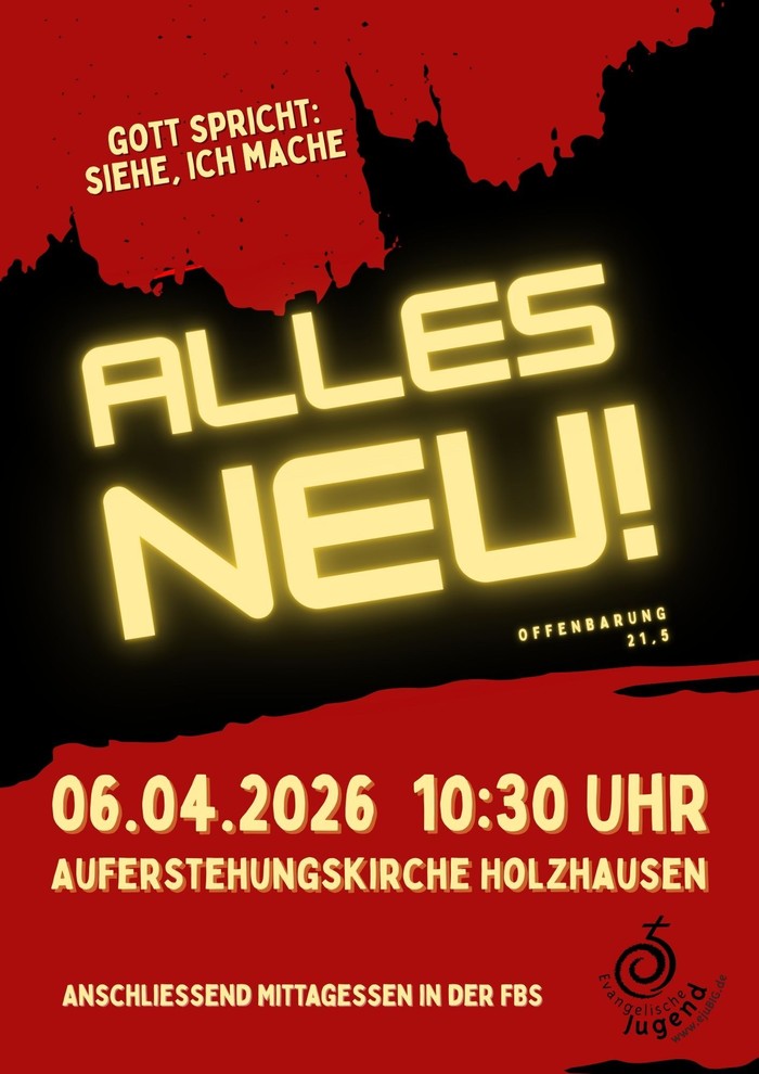 Wir laden Euch herzlich zum Ostertreffen ein! Unter dem Titel "Alles Neu!" möchten wir mit Euch über die Jahreslosung nachdenken: Wo erwarten wir neues, wo sehnen wir uns danach - und wo sollen die Dinge lieber bleiben, wie sie sind?