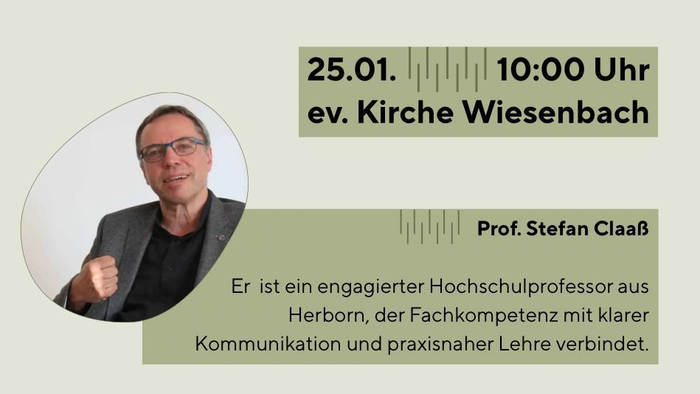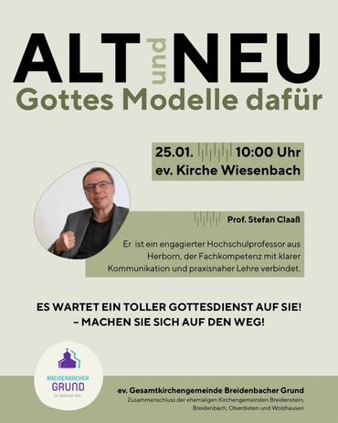Ein besonderer Gottesdienst wartet auf Dich am 25.01.26, um 10 Uhr in Wiesenbach! Prof. Stefan Claaß bekannt auch durch das Wort zum Sonntag auf ARD. Er wird mit uns darüber Nachdenken, wie wir das Altbewährte, die Tradition und das Neue, die Veränderung gemeinsam beleben können! Welche Glaubensmodelle sieht Gott in dem Ganzen? Herzlich Willkommen! Wir freuen uns auf Dich!